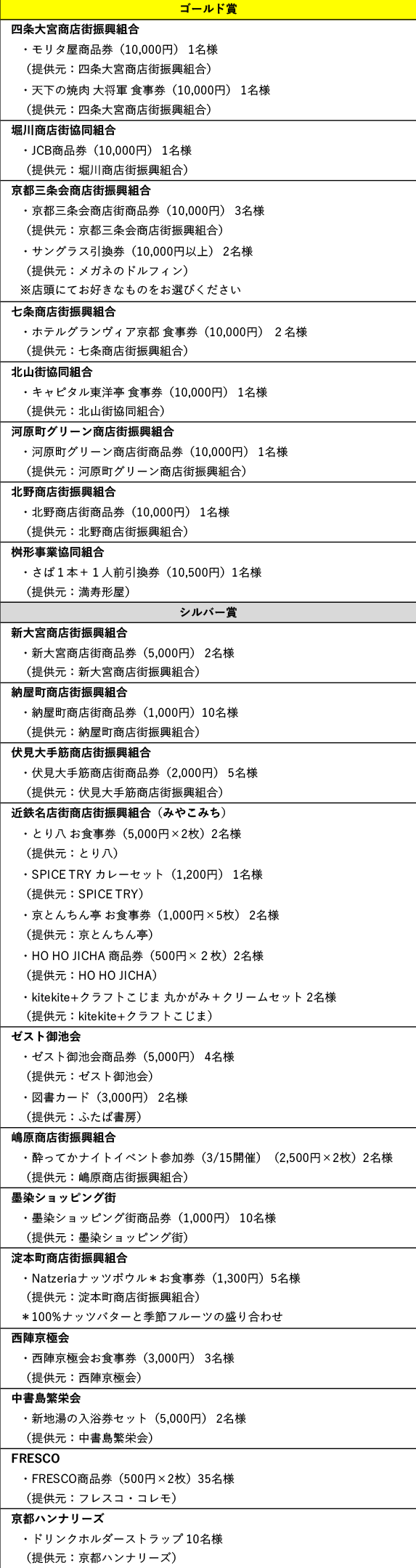 新町商店街/新大宮商店街振興組合/北山街協同組合/北野商店街振興組合/堀川商店街協同組合/京・寺町会商店街振興組合/ゼスト御池会/京都三条会商店街振興組合/七条商店街振興組合/河原町グリーン商店街振興組合/嶋原商店街振興組合/四条大宮商店街振興組合/七条中央サービス会/今熊野商店街振興組合/京都駅近鉄名店街商店街振興組合(みやこみち)/伏見大手筋商店街振興組合/納屋町商店街振興組合/深草商店街振興組合/淀本町商店街振興組合/墨染ショッピング街/桝形事業協同組合/西陣京極会/二条繁栄会/中書島繁栄会
